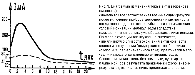 Форма, размеры и взаиморасположение электродов мало значат, другое дело — выбор самого материала. Даже устойчивая к коррозии нержавеющая сталь в ходе электролиза хоть и в мизерных количествах, но растворяется в анолите, причем больше те сорта, которые чувствительнее к магниту. Поэтому притягивающийся к магниту материал не годится: электрод из него после недолгого употребления становится шершавым, вес его уменьшается — идет активное растворение. Хорошие электроды получаются из столовых приборов с надписью “Нерж.”, а также из шампуров (без какого-либо изменения формы). Поскольку в водопроводной воде всегда есть примеси хлора, фтора, железа и разных солей, на бумаге обечаек образуются пятна, а на электродах (особенно катоде) — матовый налет. Последний легко снимается ватным тампоном, смоченным уксусом; можно также поменять электроды местами — налет исчезнет. А обечайки следует иногда обновлять. Подготовка прибора к работе начинается с заполнения его (начиная со стаканов, чтобы не всплывали) водой до одинакового уровня, на 15—20 мм ниже кромок обечаек. Затем опускаются в стаканы и подвешиваются на крючки электроды, к вилке разъема подсоединяется шнур, и прибор включается в сеть. Об успешном ходе активации будет свидетельствовать один интересный признак: возникновение заметной разности уровней воды во всех трех емкостях за счет так называемого осмоса. Кислотная вода (в стакане, электрод которого подключен через диод) понизит свой уровень относительно нейтральной воды в канистре, а щелочная, наоборот, повысит его на туже величину (около 3—6 мм). Степень кислотности и щелочности обычно оценивается так называемым водородным показателем “рН”, измеряемым практически недоступным в быту прибором “Иономер”. По его показаниям у простой воды “рН”=7, у католита поднимается до 10 и более, у анолита — 2,5 и менее. В домашних условиях полученные жидкости могут быть проверены лакмусовой бумажкой. Однако общедоступнее проба фенолфталеином, который продается в аптеках (иногда под названием “Пурген”). Растворите его таблетку в столовой ложке воды, а в другую зачерпните католит и капните в него фенолфталеином: католит немедленно станет красным (после двухнедельного хранения краснеет медленнее). Если теперь окрашенный католит капнуть в пробу анолита — произойдет обесцвечивание, что свидетельствует о достаточной активности анолита. В заключение о длительности сохранения свойств активированной воды. По моим наблюдениям, анолит остается активным и месяц, и два (возможно, что сохраняется и дольше). Католит же уже через неделю утрачивает не менее четверти своей первоначальной крепости,слабеет. В. Хахалин