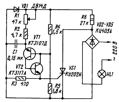 Принципиальная схема регулятора показана на рисунке. Ключевой его элемент - тиристор VS1, фаза включения которого в каждом полупериоде зависит от постоянной времени цепи (R1+R2)C1.