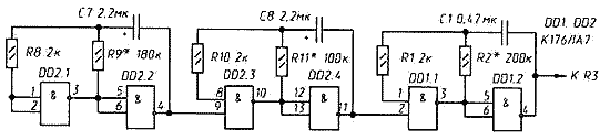 Режим работы транзистора VT1 периодически изменяется. Этот период зависит от постоянной R2C1 T=2R2·Cl), задающей частоту возбуждения генератора, выполненного на элементах DD1.1 и DD1.2, и постоянной R3C2, преобразующей меандр выходного напряжения этого генератора в «трапецевидный» ток в базе транзистора VT1.