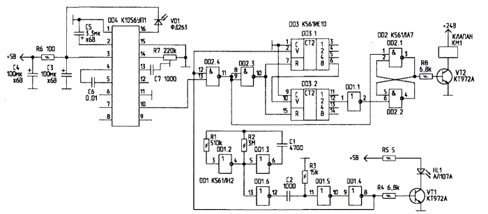 Рис. 1. Принципиальная схема фотоэлектронного устройства Устройство состоит из генератора коротких импульсов на элементах DD1.2...DD1.6, ключа на транзисторе VT1, схема которого взята из [1], фотодатчика с усилителем на микросхеме DD4, счетчика задержки на DD3 и RS-триггера на DD2.1 и DD2.2. Короткие импульсы излучаются ИК-светодиодом HL1. При приближении рук к датчику, отраженное от них излучение воспринимается фотодиодом VD1. Импульсы усиливаются микросхемой DD4 и с выхода 10 микросхемы подаются на вход 13 элемента DD2.4. На вход 12 DD2.4 подаются синхронизирующие импульсы с генератора. Когда они совпадают с выходными импульсами DD4, на выходе 11 DD2.4 появляется логический "0", который переключает RS-триггер на элементах DD2.1, DD2.2 в единичное состояние ("1" на выходе 3). Тогда открывается транзистор VT2 и включается электроклапан водяного крана КМ1. Если руки из-под крана убрать, импульсы с вывода 10 DD4 прекращаются, на входах R счетчиков DD3.1 и DD3.2 устанавливается "0", и, тем самым, разрешается работа счетчиков, заполнение которых происходит импульсами с генератора. Как только "1" появляется на выходе 12 DD3, RS-триггер сбрасывается, и клапан закрывается. Задержка сделана для того, чтобы кран не выключался при кратковременном убирании рук, например, при намыливании. Это время можно увеличить, если вход 1 DD1.1 подключить к выводу 13 или 14 DD3, или уменьшить, подсоединив этот вход к выходу 6 (5) DD3. Убирать счетчики не рекомендую, так как без них возможна неустойчивая работа электроклапана. Размещают устройство на стене таким образом, чтобы клапан надежно срабатывал при поднесении рук к крану и отключался при их убирании. Чувствительность фотодатчика регулируют подстроечным резистором R7.