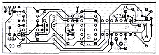 Рис. 2. Печатная плата фотоэлектронного устройства Устройство собирается на односторонней печатной плате размерами 28x84 мм (рис.2). Микросхему DD4 и светодиод VD1 обязательно экранируют тонкой жестью с обеих сторон печатной платы. Литература