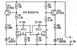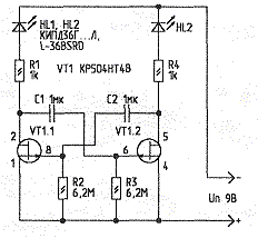 Рис. 2 Для узла, схема которого приведена на рис.2, подойдут микросхемы КР504НТ1, КР504НТ2 с любым буквенный индексом, а при подборе резисторов R3, R7 - КР504НТЗ, КР504НТ4. Кроме того, без настройки будут работать и многие полевые транзисторы серий КП103, КП101. Конденсаторы лучше использовать неполярные, например, малогабаритные К73-17 на 63 В. "Обычные" светодиоды могут быть любыми из серий АЛ307, КИПД21, КИПД35, КИПД40, а также 1-1513, L-934 и т.п. Мигающие - L-816BRSC-B, L-769BGR, L-56DGD, Т1ВК5410 и другие. Поскольку полевые транзисторы сборок КР504НТ(1 ...4) допускают максимальное напряжение исток-сток не более 10 В, напряжение питания мультивибраторов не должно превышать 10...12 В. Источники