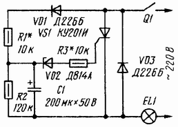 Этот автомат уменьшает броски тока через осветительную лампу в момент ее включения. При замыкании контактов выключателя Q1 ламла EL1 начинает светиться вполнакала, поскольку ток через нее протекает только во время положительных полупериодов сетевого напряжения на нижнем, по схеме, проводе питания. Во время же отрицательных полупериодов заряжается конденсатор С1. Как только напряжение на конденсаторе достигнет напряжения стабилизации стабилитрона VD2, откроется тринистор VS1 и лампа вспыхнет почти в полный накал.