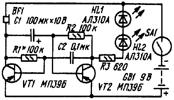 Имитатор (рис.1) представляет собой несимметричный мультивибратор, выполненный на двух транзисторах. В одно плечо мультивибратора включен головной телефон BF1, в другое - последовательно соединенные светодиоды HL1 и HL2. Обе нагрузки работают поочередно - то раздается звук из телефона, то вспыхивают светодиоды - глаза утки. Включается мультивибратор герконом SA1, к которому приближается постоянный магнит во время наклона игрушечной утки или подносится в виде "волшебной палочки" (ею может быть, например, карандаш, на конце которого замаскирован небольшой магнит).