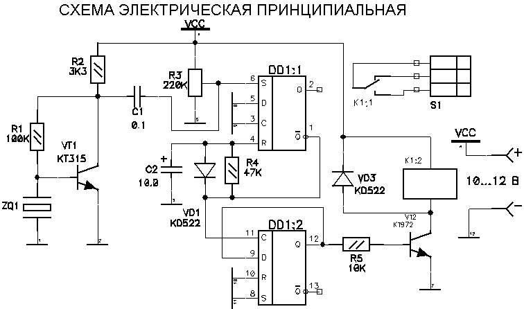 Микросхема DD1: К561ТМ2. Реле можно использовать РЭС9 (круглое) на 12 вольт. В качестве пьезоэлемента можно использовать ЗП-22 или электретный микрофон от магнитолы. Источник: r-ks.ru