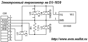 Электронный термометр позволит вам вести наблюдение за температурой различных объектов или сред, в которые будут помещены датчики, и визуально наблюдать за происходящими изменениями, а так же контролировать нахождение температуры в норме, предупреждая Вас звуковым сигналом, если потребуется. Основой устройства, подключаемого к последовательному порту, служит цифровой термометр DS18B20, фирмы Dallas Semiconductor.