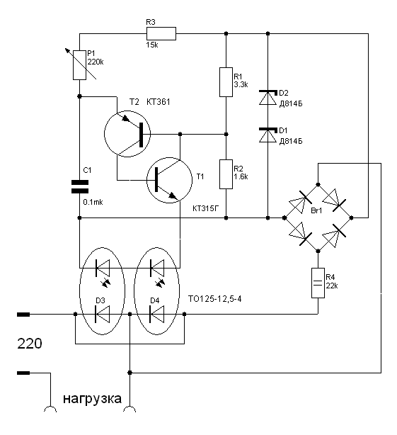 Рис.1 Принципиальная схема регулятора мощности Печатная плата не разрабатывалась, устройство было собрано навесным монтажем и использовалось для регулировки темпратуры фена. ! Для управления более мощной нагрузкой тиристоры необходимо поставить на радиатор (150 кв.см. и более) Для устранения помех, создаваемых регулятором, желательно на входе поставить дроссель. Источник:msevm.com