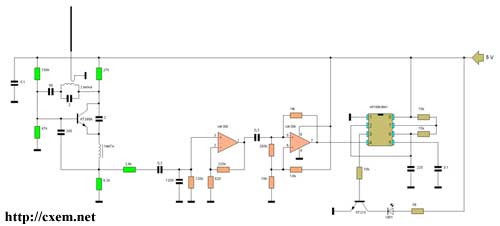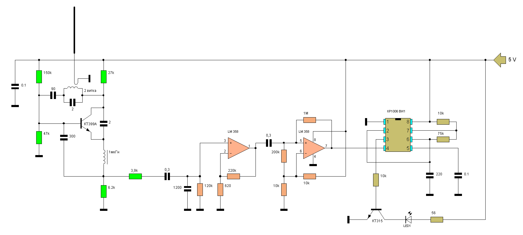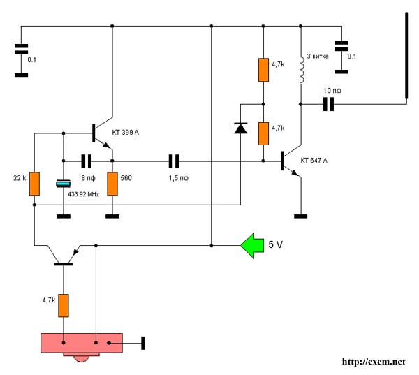 Передатчик управляется ИК приемником промышленного производства типа TSOP со встроенным демодулятором несущей ( 36 КГц) . При передаче используется 100% АМ .То есть если 1 ( несущая есть ) если 0 ( несущей нет и передатчик выключен ). Оконечный каскад передатчика приоткрыт в режиме молчания током 15 мА. Антенны приемника и передатчика – четвертьволновые отрезки провода ( 16 см ). Приемник – сверхрегенератор с весьма хорошей повторяемостью ( изготовлено 3 экземпляра устройств совершенно без проблем на частоты 433,92 и 418 МГц на СМД элементах ) и отличной чувствительностью. Его настройка сводится к подбору емкостей между коллектором и эмитером транзистора и емкости и индуктивности колебательного контура и катушки связи с антенной. Контролировать сигнал принятый приемником можно с выхода первого ОУ ( 1 нога LM 358 ) подключив туда вход контрольного УНЧ . Второй ОУ входящий в состав микросхемы – пороговое устройство , с него на таймер идет уже цифровой сигнал. Таймер восстанавливает по приходу высокого уровня несущую частоту 36 кГц и управляет транзистором, зажигающим ИК светодиод.