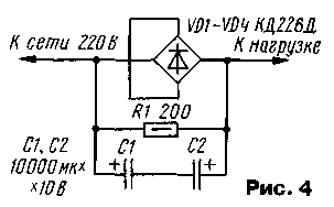В приведенной методике не учитывалась обмотка (обмотки) накала ламп. Ее можно рассчитать независимо от расчета повышающей обмотки, считая потерю напряжения в ней как произведение тока на ее сопротивление и учитывая, что потеря эффективного переменного напряжения в первичной обмотке обычно составляет около 2 %. Следующий важный вопрос — как сделать мощный трансформатор, не создающий акустического фона? В статье [7] рассматривались некоторые причины "гудения" трансформаторов и сделан совершенно правильный вывод, что нужно увеличивать число витков на вольт на 15...20 % в сравнении с расчетным значением. Эта мера снижает гудение только магнитопровода, да и то не всегда. Акустический фон, создаваемый нагруженной обмоткой, наоборот, растет при увеличении числа витков. Метод борьбы с гудением обмотки неожиданно прост — это секционирование, такое же, как в выходном трансформаторе. Иногда достаточно разместить первичную обмотку между половинками вторичной, и акустический фон уменьшается до приемлемого уровня. Еще одна возможная причина гудения трансформатора питания — это насыщение магнитопровода постоянной составляющей напряжения, которая хоть и мала, но нередко присутствует в сети. Эта причина проявляется, как правило, только в тороидальных трансформаторах с неразрезным магнитопроводом, причем эффект насыщения усиливается при увеличении числа витков и при уменьшении сопротивления первичной обмотки. Метод борьбы с этим явлением только один — установка последовательно с первичной обмоткой трансформатора фильтра, задерживающего постоянную составляющую тока. Схема фильтра для сетевого трансформатора на мощность до 300 Вт, заимствованная из американского усилителя LAMM M1.1 разработки В. Шушурина [8], приведена на рис. 4. Если трансформатор мощнее, то емкость оксидных конденсаторов надо пропорционально увеличить, а сопротивление резистора — уменьшить. На рис. 1 и 2 показаны две практические схемы ламповых однотактных усилителей: мощностью 10 Вт на тетродах в триодном включении и 12 Вт — на тетродах. Выходной трансформатор для первого из них описан выше, а трансформатор для тетродбв собран на таком же магнитопроводе, но имеет немного другие обмотки. Его первичная обмотка — 1512 витков провода диаметром 0,35 мм — состоит из пяти секций: 168, 336, 504, 336 и 168 витков. Между ними расположены четыре секции вторичной обмотки для нагрузки сопротивлением 4 Ом — по 77 витков провода диаметром 0,77 мм, соединенные параллельно. Поверх второй и третьей секций этой обмотки без прокладок намотаны две секции по 32 витка провода диаметром 0,72 мм, соединенные параллельно. Эта обмотка соединяется последовательно с обмоткой в 77 витков; так получается вторичная обмотка для нагрузки 8 Ом. Прокладки между первичной и вторичной обмотками и между слоями первичной, а также прокладки в зазорах магнитопровода такие же, как в трансформаторе для усилителя на триодах. Выходное сопротивление усилителя с триодами на выходе для нагрузки 8 Ом составляет 2,4 Ом, а с тетродами — 1,6 Ом. На выходе для нагрузки 4 Ом — ровно в два раза меньше. Наконец, замечание о выборе конденсаторов для сигнальных цепей. Для использования в высококачественных усилителях наиболее пригодны конденсаторы с диэлектриком из полипропилена (К78-6, К78-2) и с бумажным диэлектриком (К40У-9, МБМ) на напряжение не менее