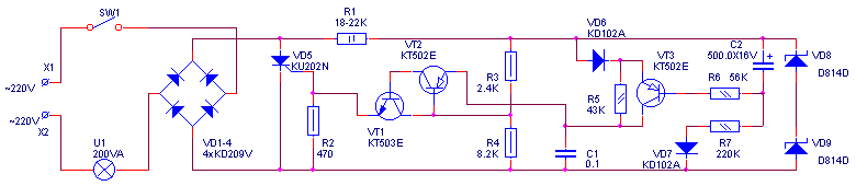 При применении данного устройства срок службы ламп значительно увеличивается, некоторые экземпляры работают до 4 лет. Этот эффект обеспечивается постепенным разогревом нити накала, как известно, сгорание лампы происходит именно в момент включения. К тому же при включении в темное время суток имеется удобство в плане плавного изменения освещенности, так как глаза успевают адаптироваться и не наступает эффекта ослепления. R5 определяет уровень начального накала лампочки. R7 определяет скорость нарастания накала, в пределах 3-5 секунд, меньшее значение не предохраняет лампу от сгорания. R1 обеспечивает необходимое напряжение питания (требует подбора при мерцании лампы при помехах в сети). Устанавливать рекомендуется в разрыв провода около выключателя, или, если портит эстетику помещения, непосредственно около лампы (возможно в ней).
