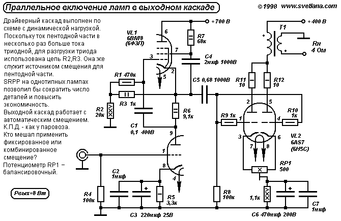 Усилитель с параллельным включением ламп в выходном каскаде Главная -> Статьи -> Ламповые усилители низкой частоты -> Усилитель с параллельным включением ламп в выходном каскаде