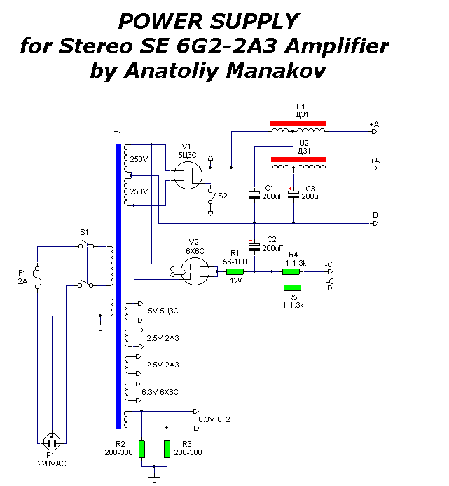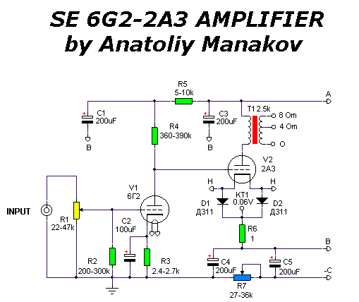 Усилитель выполнен на лампах, 6г2, которая служит усилителем напряжения(драйвером) для лампы оконечного каскада- 2А3 с непосредственным подключением сетки 2А3 в анодную цепь 6Г2. Нерабочие ножки лампы 6Г2 соединены на корпус. Для соблюдения рабочего режима выходной лампы 2А3, питание лампы 6Г2 выполнено симметричным относительно катода выходной лампы с «виртуальной землёй», резистор R7 служит для настройки тока покоя выходного каскада 60мА, который определяется по падению напряжения 0,06В на резисторе R6. Предварительная настройка делается так: Сетка выходной лампы отключается от анода драйвера и замыкается на катодный резистор 1 Ом. На аноде лампы драйвера выставляется напряжение -50-55В относительно точки В(средней точки анодной обмотки силового трансформатора). Затем сетка выходной лампы подключается к аноду драйвера и производится окончательная настройка по току анода выходной лампы, который должен быть порядка 60мА при падении напряжения 0,06В на резисторе R6 номиналом 1 Ом. Диоды Д311 в накально-катодной цепи лампы 2А3 можно заменить на резисторы 10 Ом. Электролитические конденсаторы 200мкФ рассчитаны на рабочее напряжение 400В, С2 на рабочее напряжение 10В.