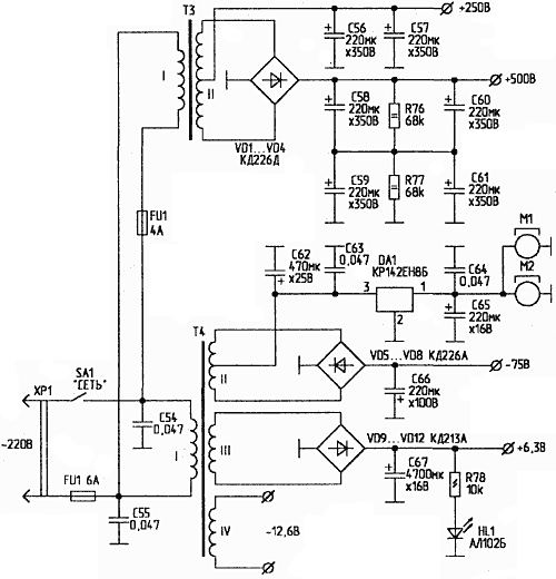 Поэтому выгоднее использовать более экономичный режим работы ламп в классе В. Недостатком данного режима является повышенный уровень нелинейных искажений. Связано это с тем, что в данном режиме рабочая точка лампы лежит в более нелинейном начальном участке характеристики лампы. При двухтактной схеме включения ламп это вызывает искажения в виде "ступеньки". Существует весьма простой способ компенсации подобных искажений. Для этого усилитель необходимо охватить глубокой отрицательной обратной связью. Предлагаемый усилитель питается от двухтрансформаторного источника питания (рис.1). Трансформатор ТЗ обеспечивает питанием анодные цепи всей схемы и сеточные цепи выходных ламп усилителя, Т4 формирует накальные напряжения, напряжения смещения на сетках выходных ламп и напряжение для питания вентиляторов, охлаждающих усилитель. Для уменьшения уровня фона накал ламп предварительного усилителя осуществляется от источника постоянного тока.
