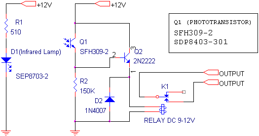 Представленная выше схема детектора - это простое световое реле или детектор, срабатывающий на инфракрасное излучение светодиода Д1. Основное применение устройства - это системы контроля. При отсутствии излучения диода Д1 на фототранзистор Q1 реле К1 находится в нормально разомкнутом состоянии. Существуют различные варианты конструкции устройства. Возможен вариант, когда фототранзистор Q1 срабатывает от отражённого луча (в качестве отражателя может использоваться зеркало) инфрадиода Д1. Достоинством такого реле является отсутствие видимого глазом излучения . Чувствительность устройства определяется параметрами D1, Q1, R2 и конструкцией устройства.
