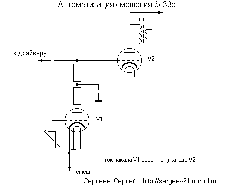 Не секрет, что лампа 6с33с плохо держит режим фиксированного смещения. При автосмещении нужен довольно мощный резистор и для качества это не лучший вариант. Предлагаю схемы (пока чисто теоретические, может кто попробует на практике :) ) Схема 1. Вариант смещения. При повышении тока лампы 6с33с, больше нагревается накал лампы в регуляторе и напряжение смещения увеличивается, что ведет к снижению тока 6с33с. Схема 2. Лофтин-Уайт, где лампа регулятора используется, как драйверная. Ток накала регулирующей лампы в обоих схемах должен соответствовать току катода 6с33с.