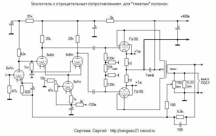Усилитель собран на лампах 6н1п, 6н6п и ГУ-50 в