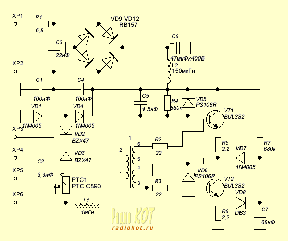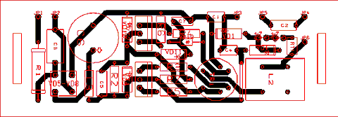 тока при включении. Мощность всех резисторов 0.125 Вт, за исключением R1 - мощностью 1Вт. RTC1 - терморезистор с положительным коэффициентом сопротивления, производитель не известен. Номинальные напряжения конденсаторов: C7 - 63V; C1,C4 - 250V; C3, C6 - 400V; C2, C5 - 630V. Автор применил неполярные конденсаторы фирмы National Semiconductors и Philips. Емкость конденсатора C6 может быть уменьшена до 20мкФ. Cтабилитроны VD2 и VD3 могут быть заменены на один униполярный с напряжением стабилизации 47-60 Вольт. Диод VD8 - тригерный диод DB3 производства SGS-THOMSON. Индуктивность L2 - "капелька" в литом корпусе. Дроссель L1 намотан внавал 300-ми витками провода ПЭВ-2-0.3 на ферритовом сердечнике М2000НМ типоразмера Ш4x4. Обмотки трансформатора TR1 намотаны проводом ПЭВ-2-0.3 на ферритовом кольце М2000НМ типоразмера 10x6x4.5 и содержат 7 витков (1-2), 3 витка (3-4), 3 витка (5-6), причем начала обмоток соответствуют четным цифрам в нумерации. Печатная плата разрабатывалась для установки в корпус стандартного светильника, имеющего установочные отверстия на расстоянии 140mm и объем для дросселя 100x35x35. В плате размерами 100x35 и толщиной 2mm сделаны пазы, в которые проведены и зажаты дюралевые пластины 15x40, в которых проделаны отверстия d=4.2mm для крепления устройства к корпусу светильника. Плата утапливается в корпус светильника так, чтобы исключить электрический контакт с корпусом. Для этой же цели собранную плату покрывают защитным лаком. Транзисторы VT1 и VT2 установки на радиатор не требуют. Провода, идущие к контактам лампы необходимо свить между собой. Все соединения необходимо выполнить проводами, допускающими ток 1A и устойчивыми к воздействию внешней среды, в которой предполагается использовать светильник. Источник: www.radiokot.ru