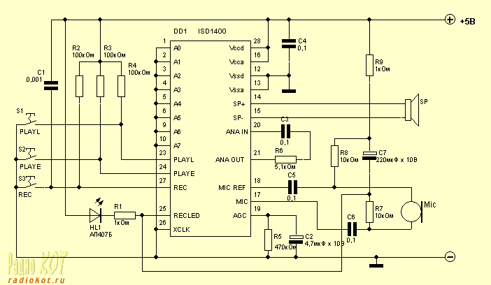 Все эти вкусности размещаются в 28-ногом корпусе в двух исполнениях - PDIP и SOIC. Есть еще вариант промышленного исполнения (там нижняя граница рабочей температуры аж -70 градусов по Цельсию). Теперь перейдем, пожалуй, к предметному обсуждению возможностей, для чего глянем на типовую схему включения микросхемы: Пробежимся быстренько по выводам. А0-А7 имеют двойное назначение: первое - адресация при наличии нескольких сообщений и второе - переключение режимов работы микросхемы. SP+, SP- - не ломайте голову - это выводы для подключения динамической головки сопротивлением не менее 16 Ом, которая будет воспроизводить то, что записано в утробе чипа. MIC, MIC REF предназначены для подключения микрофона (электретного). AGC (automatic gain control) - автоматическая регулировка уровня записи (АРУЗ по нашему). ANA IN - если не нужно писать с микрофона, то на этот вход подается сигнал с любого другого источника. ANA OUT - выход внутреннего предварительного усилителя. PLAYL - если на этот вывод подать сигнал низкого уровня, начнется воспроизведение, и будет продолжаться до тех пор, пока низкий уровень сохраняется. PLAYE - воспроизведение начинается при поступлении импульса на этот вход и заканчивается по окончании сообщения. RECLED - сюда вешается светодиод для индикации записи. XCLK - вход для внешнего тактового генератора. REC - при поступлении низкого уровня сигнала начинается запись, которая будет продолжаться до тех пор, пока сохраняется низкий уровень на этом входе. Тех, кому мало подобного описания, отправлю к даташиту, который можно совершенно даром скачать с сайта, указанного в начале этого изложения. Ну, а все остальные могут перейти к рассмотрению работы схемы. Хотя тут рассматривать то… ну да ладно. Нажимаем кнопочку S3 - REC - на входе REC образуется низкий уровень и начинается запись. Отпускаем нажатую кнопочку - запись останавливается - то есть запись идет только при нажатой кнопке. Дальше, если мы хотим прослушать запись так же как и записывали - то есть давя из последних сил на кнопку, то наживаем кнопку S1 - PLAYL и слушаем записанное. Как только кнопка отпускается, воспроизведение останавливается. Ну и наконец, если мы хотим как белые люди прослушать все сообщение целиком, то жмем кнопку S2 - PLAYE - в этом случае, воспроизведение остановится по окончании записи. В общем, как мне кажется весьма и весьма удобная вещь для организации всякой развлекухи и не только. Как вам, например дверной звонок, который будет орать "Сова, открывай, медведь пришел!" или цветочный горшок, напоминающий вам голосом любимой тещи о том, что его надо полить - короче применений масса. Источник: www.radiokot.ru