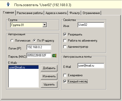 до 300 пользователей. Приложение устанавливается на систему, имеющую прямое подключение к Инернет. В роли сервера может выступать любая рабочая станция, не менее Pentium 200MHz, 32 Mb RAM, в качестве ОС на такой конфигурации можно использовать Windows NT Server. IP-адрес сервера для работы UserGate не принципиален, однако лучше использовать 192.168.0.1, если впоследствии вы решите использовать технологию NAT. После установки программы зайдите в раздел "Настройка". Здесь необходимо создать новую группу пользователей, для этого нажмите "Добавить". После этого, зарегистрируйте учетные записи членов вашей сети. Каждый пользователь может авторизовываться по логину и паролю, это весьма полезно, если за одним компьютером работает несколько человек. Также возможна авторизация по IP и Mac адресу.
