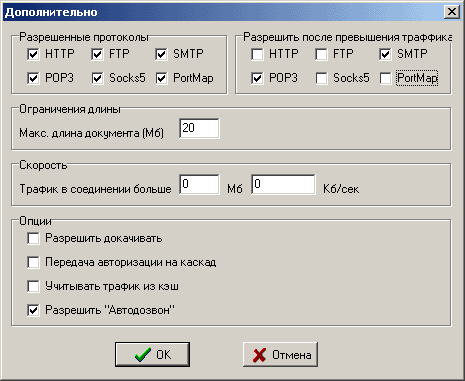 "Дополнительные настройки" - здесь можно задать, какие протоколы работы с Интернет разрешены в Вашей сети, там же можно установить, какие сервисы будут доступны пользователю после превышения квоты: можно полностью закрыть доступ, или же оставить только электронную почту. Только нужно помнить, что по каналам e-mail при желании вполне можно пересылать значительные объемы информации.