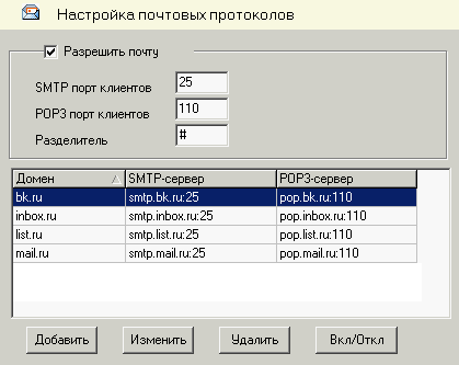 Проследите, чтобы не стояла галочка возле параметра "Не использовать прокси-сервер для локальных адресов", иначе не будет работать встроенный локальный web-сервер UG. UserGate может работать почтовым туннелем, пересылая пакеты писем. Этот раздел нужно настраивать, если в вашей сети пользуются почтовыми клиентами типа Outlook Express, The Bat или аналогичными. На работу с почтой через Web-интерфейс данный раздел никак не влияет.![]() На рисунке уже прописаны сервера популярных бесплатных почтовых служб, и вы легко сможете добавить новые. Помимо этого, все используемые E-mail адреса должны быть зарегистрированы в UG в разделе "Пользователи", иначе почта работать не будет.