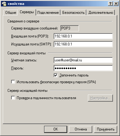 39.5 Настройка почтового клиента Нужно отредактировать учетную запись почтового клиента: в поле серверов указать локальный IP-адрес компьютера с UserGate, например 192.168.0.1. На иллюстрации указана настройка Outlook Express для работы почтового ящика user@mail.ru через сервер UserGate. Прочие клиенты настраиваются так же. Логин для E-mail должен быть формата: "логин#ваш e-mail". Например, логин для ящика user@mail.ru будет выглядеть так: user#user@mail.ru.