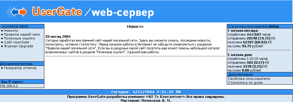 пользователей, для доступа к нему нужно в браузере набрать команду: "usergate". Помимо стандартных функций статистики, сайт содержит базовые правила работы в сети и каталог ссылок. При желании вы можете легко добавить новые разделы, например, профили пользователей, чтобы члены сети знали друг друга, или каталог фильмов и музыки на сервере. Используйте для этого любой HTML-редактор. Не забудьте ознакомиться с каталогом ссылок. Совет: UserGate можно использовать, даже если у вас нет локальной сети, это может пригодиться, если к данному компьютеру имеет доступ несколько пользователей и для каждого необходимо считать Интернет трафик/время отдельно. Для работы программы в локальном режиме после установки укажите в настройках браузера IP адрес 127.0.0.1 в качестве прокси-сервера. Разумеется, для пользователей необходимо использовать авторизацию по логину и паролю. UserGate интенсивно развивается, особенно после появления прямого конкурента