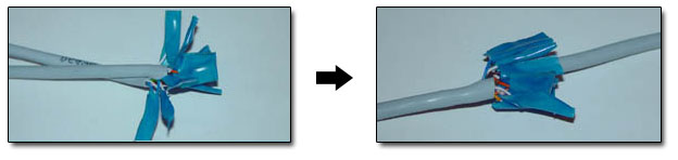 4. Хорошо изолируем место скрутки. Если восстановленный участок находится на открытом воздухе, то, помимо множества слоев изоленты, необходимо использовать какой либо полиэтилен, который тоже нужно плотно прикрутить, дабы он защищал контакты от влаги. Качественная скрутка сможет прослужить вам несколько лет.