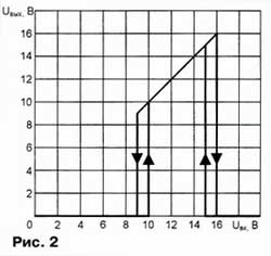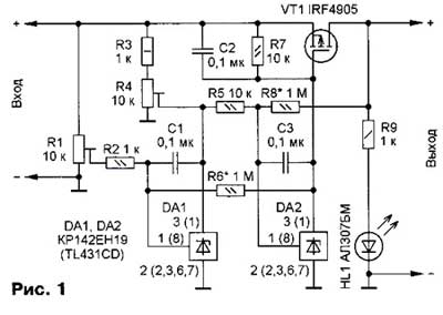 Нагрузку коммутирует мощный ключевой р-канальный полевой транзистор IRF 4905 ( VT 1), которым управляют две микросхемы - параллельные стабилизаторы напряжения - КР142ЕН19 ( DA 1 и DA 2), работающие в режиме компаратора. Если напряжение на входе микросхемы КР142ЕН19 меньше порога ее переключения (2,5 В), то микросхема закрыта и потребляет ток около 1 мкА. В противном случае ток через микросхему резко возрастает (с крутизной примерно 2 А/В), поэтому его ограничивают внешними элементами так, чтобы он не превышал 100 мА. На микросхеме DA 1 собран узел, реагирующий на повышение напряжения питания, а на DA 2 - на понижение. Характеристика устройства показана на рис. 2.