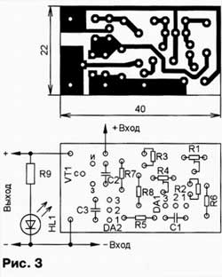 Рассмотрим плавное увеличение напряжения питания. Пока оно меньше 10 В, обе микросхемы закрыты и ток через резистор R 7 невелик. Напряжение на этом резисторе недостаточно для открывания транзистора VT 1, нагрузка отключена, светодиод HL 1 не горит. Когда напряжение питания возрастет до 10 В, напряжение на управляющем входе микросхемы DA 2 достигнет 2,5 В и микросхема откроется. Ток через нее возрастет, напряжение на резисторе R 7 увеличится, и транзистор откроется и подключит нагрузку. Благодаря малому сопротивлению канала открытого транзистора VT 1 (0,02 Ом) падение напряжения на нем будет невелико и почти все входное напряжение поступает на нагрузку. Светодиод HL 1 индицирует включенное состояние нагрузки. Когда напряжение питания достигнет 16 В, откроется микросхема DA 1, напряжение на ней не превысит 2 В, вследствие чего микросхема DA 2 закроется, транзистор VT 1 также закроется и отключит нагрузку. Светодиод HL 1 погаснет. При плавном уменьшении напряжения питания нагрузка будет включена при напряжении 15 В и отключена при 9 В. Таким образом, каждый порог переключения имеет гистерезис, что повышает надежность переключения и исключает многократную коммутацию нагрузки, когда нестабильное напряжение питания колеблется на пороговом уровне. Гистерезис верхнего порога осуществлен с помощью положительной обратной связи через резистор R 6, нижнего порога - через резистор R 8. Указанные выше пороги срабатывания могут быть изменены в широких пределах: верхний - подстроечным резистором R 1, нижний - R 4. Увеличение сопротивления резисторов R 6 уменьшает гистерезис верхнего порога, R 8 - нижнего. Для уменьшения влияния помех в цепь отрицательной обратной связи микросхем включены конденсаторы С1 и СЗ, но следует учесть, что они уменьшают быстродействие устройства. При токе нагрузки 10 А падение напряжения на открытом транзисторе VT 1 не превысит 0,2 В, а рассеиваемая мощность будет не более 2 Вт, поэтому транзистор можно использовать без теплоотвода. При токе 20 А рассеиваемая мощность может достичь 8 Вт, поэтому необходим небольшой теплоотвод или включение двух транзисторов параллельно. Напряжение питания с учетом пульсаций должно быть меньше предельно допустимого напряжения микросхем - 30 В. Конструкция и детали. Транзистор IRF 4905 ( VT 1) - полевой с р-каналом в корпусе ТО-220 или IRF 4905 L в корпусе ТО-262, также можно использовать IRFU 5305 в корпусе ТО-251АА. Микросхему КР142ЕН19 ( DA 1 и DA 2) можно заменить зарубежным аналогом TL 431 CLR . Все конденсаторы - К10-17 или аналогичные импортные, постоянные резисторы - Р1-4, МЛТ, С2-33, подстроечные - СПЗ-19. Для этих деталей рассчитана плата, чертеж которой показан на рис. 3. Она изготовлена из односторонне фольгированного стеклотекстолита.