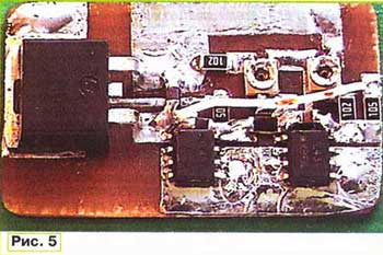 Если необходимо уменьшить габаритные размеры устройства, то надо применить детали для поверхностного монтажа: транзистор VT 1 IRF 4905 S - в корпусе D 2- Pak или IRFR 5305 - в корпусе D - Pak , микросхемы DA 1 и DA 2 TL 431 CD - в корпусе SOP -8, подстроечные резисторы PVZ , постоянные резисторы и конденсаторы - типоразмера 1206. Чертеж печатной платы для таких деталей показан на рис. 4, фотография смонтированной платы - на рис. 5.