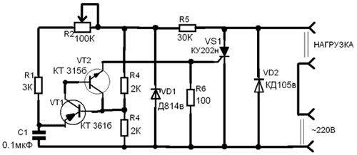 Ниже приведена схема регулятора мощности для паяльника. Схема неоднократно была собрана мною и моими знакомыми. Главное преимущество данной схемы, доступность компонентов: дубовые КТ315 и КТ361, всеми известный Д814 и КУ202Н, не говоря уже о резисторах и конденсаторах (один в схеме). Мощность регулятора: до 10А (в амперах), но зависит от тиристора и VD2.