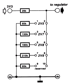 Отмечая, что новые процессоры Intel, как правило, требуют замены материнской платы, Р.Шульц обращает внимание на то, что процессоры AMD K6-2, полностью реализующие свои возможности на "материнках" Super 7, неплохо приспособдены и для апгрейда ПК на "материнках" Socket 7. Дело в том, что, например, AMD K6-2 400 "понимает" множитель частоты системной шины "х2" как "х6" и позволяет таким образом штатно работать в такой материнке на частоте 6х66=396 МГц. Единственная загвоздка - напряжение питания ядра процессора AMD K6-2: оно составляет всего 2,2 В, что чаще всего перемычки материнки Socket 7 не обеспечивают. Выход из положения - найти на печатной плате резисторы, задающие напряжение питания ядра, они обычно расположены рядом с самими "джамперами". Типовая схема переключения напряжений стабилизатора питания показана на рис.1.