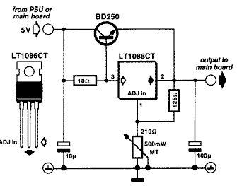 Puc.1 Достаточно включить параллельно пару резисторов в земляном плече делителя (опытном путем, измеряя напряжение на выходе стабилизатора или на контактах VCC2 разьема Socket 7 при выноутом процессоре), чтобы обеспечить штатное напряжение питания ядра. В самых ранних пентиумовских материнских платах, не обеспечивающих отдельного пониженного напряжения питания ядра, придется установить дополнительный стабилизатор, возможная схема которого приведена на рис.2.