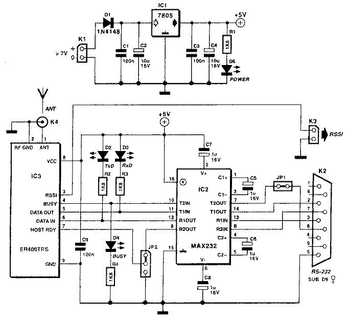 Радиочастотный беспроводной RS232-интерфейс (рис.1) обеспечивает обмен информацией между двумя ПК на небольших расстояниях. Он заметно дешевле таких аналогичных решений, как Bluetooth, Wireless LAN, DECT. В его основе - радиомодуль ER400TRS, разработанный Радиоассоциацией малых мощностей (LPRA - Low Power Radio Association, http://www.lprs.co.uk/main/ viewdatasheet.php?datasheetref=112). Это полудуплексный ЧМ-трансивер, работающий на любом из 10 каналов в диапазоне 433,25,..434,35 МГц (70-см панЕвропейская ISM ассоциация) с программируемой от 1 до 10 мВт выходной мощностью и обеспечивающий передачу данных с потоком 19,2 кбит/с на расстояние до 250 м в условиях прямой видимости и 30 м в зданиях. Потребляемая мощность в режиме приема 17 мА, передачи - 23 мА, ожидания - 2 мА.