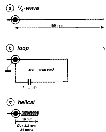 Puc.1. Три варианта антенн показаны на рис.2: первая (а) - простейший кусок провода длиной четверть длины волны, т.е. 15,5 см. Если она расположена не непосредственно у трансивера, - ее необходимо соединять 50-омным коаксиальным фидером. Второй вариант (b) - для исполнения на печатной плате в виде рамки площадью 400...1000 мм2; ее необходимо настроить в резонанс конденсатором небольшой емкости. Третий вариант (с) - самый миниатюрный, это 24 витка провода ПЭЛ-0,5 на оправке диаметром 3,2 мм с длиной намотки 19 мм.