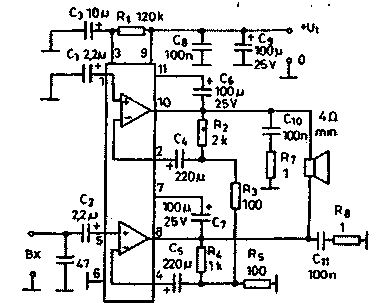 Так как R3=R5 и R2=2R4, усиление схемы Ku=4R4/R5. Поскольку минимальный импеданс нагрузки каждой половины усилителя составляет 2 Ом, в диагональ моста (между выходными точками) можно включить, самое малое, динамик на 4 Ом. Поэтому при напряжении питания (U1) например 16В максимальная выходная мощность будет 18-20 Вт. Как видно, теперь нет необходимости в выходных конденсаторах большой емкости: в обеих выходных .точках присутствуют хорошо согласованные, идентичные напряжения, и, следовательно, разность потенциалов между клеммами громкоговорителя в состоянии покоя минимальна.