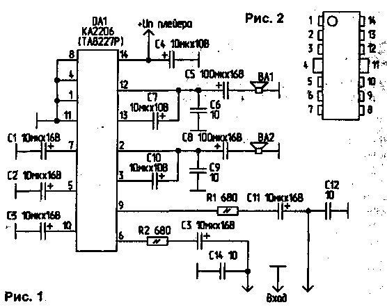 Бывает, хочется послушать музыку во дворе с друзьями. Но тащить большой магнитофон неудобно, а плейер предназначен для одного. Предлагаю простую схему усилителя с выходной мощностью около 3 Вт (рис.1). Главное достоинство схемы - низкое напряжение питания (как и у плейера - 3...6 В). Эту схему можно использовать в минимагнитофоне, чтобы повысить его мощность. Динамики можно использовать любые, но с мощностью не менее 3 Вт и с сопротивлением 4 Ом. Вместо КА2206 можно использовать ИМС ТА8227Р. Цоколевка микросхемы приведена на рис.2.
