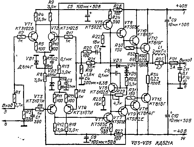 Усилитель работает в режиме АВ и выполнен с использованием схемотехники предыдущего усилителя. Усилитель также обладает полной симметрией для входного синусоидального сигнала (одинаковость входных сопротивлений для положительной и отрицательной полуволн сигнала), что позволяет снизить нелинейные искажения. Принципиальная схема усилителя приведена на рис.1. Он содержит дифференциальный каскад на комплементарных транзисторах (VT1-VT4), каскад усиления напряжения (VT5, VT7) и выходной каскад (VT8-VT13). Напряжение питания входного каскада стабилизировано (с помощью стабилитронов VD1, VD2). Транзисторы выходного каскада включены по схеме с общим коллектором. Температурную стабилизацию тока покоя выходных транзисторов обеспечивают диоды VD3-VD5, установленные на общем с транзисторами VT12, VT13 теплоотводе. Элементы LI, R35, R36, C11, R20, С7 предотвращают самовозбуждение усилителя на высоких частотах.