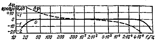 Puc.1 Диоды VD3 - VD5 располагают на радиаторе выходных транзисторов. Катушка L1 содержит 10 витков .провода ПЭВ-2 0,8, намотанного на резисторе R35 (МЛТ-2). Как и в предыдущем усилителе, вначале необходимо проверить исправность всех элементов. После монтажа (проверив его правильность) усилитель, аналогично предыдущему, подключают к источнику питания. Настройка заключается в установке резистором R29 начального тока выходных транзисторов в пределах 50 ... 70 мА. Амплитудно- и фазо-частотная характеристики налаженного усилителя приведены на рис.2.