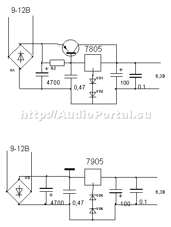 Стабилизаторы верхнего и нижнего этажей усилителя идентичны, для упрощения показана схема стабилизатора с номиналами элементов и режимами через косую черту. Для питания накалов всех ламп применены стабилизаторы на микросхемах 7805 (умощненные транзисторами для питания накалов 6С19П) и 7905 (для питания накала 6Н26П) в штатном включении, но с включением дополнительных кремниевых диодов для получения напряжения стабилизации 6.3В. При этом подбором типов диодов можно в небольших пределах подстраивать выходные напряжения стабилизаторов.