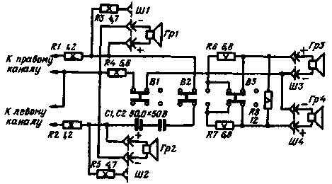 Специалистами Германской Демократической Республики создана установка "Квадроэффект", создающая псевдоквадрафонический эффект звучания. Принципиальная схема установки приведена на рисунке. Основные сигналы излучаются головками Гр1 я Гр2. Разностный сигнал излучается дополнительными головками Гр3 и Гр4, включенными в противофазе. Резисторы R6 и R7 служат для уменьшения уровня сигнала, подаваемого на дополнительные головки.