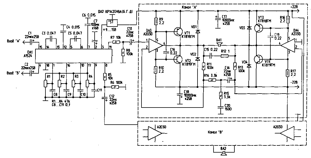 Микросхема А2030, на мой взгляд, является наилучшим из существующих на данный момент интегральных усилителей мощности. По таким важнейшим показателям как выходная мощность и коэффициент гармоник он далеко обгоняет другие имеющиеся на рынке интегральные усилители. Предлагаемый стереофонический УЗЧ на базе А2030 обладает низким коэффициентом гармоник и большой выходной мощностью. Параметры УЗЧ Выходная мощность, Вт - при Рн=4 Oм 2х180 - при Rн=8 Ом 2х90 Коэффициент гармоник,% не более 1 Напряжение питания, В ± 22