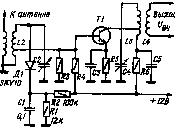 При работе транзисторного радиоприемника на частотах, вблизи которых работают мощные радиостанции, возникает опасность выхода из строя первого транзистора из-за высоких напряжений, наводимых в антенне. При использовании распространенного способа защиты двумя диодами, включенными встречно-параллельно, при большом сигнале, превышающем уровень 0.7 В, появляются комбинационные помехи. Этого можно избежать. если воспользоваться схемой, приведенной на рисунке.