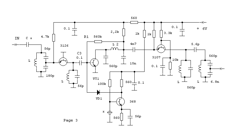 Входной сигнал и сигнал гетеродина подются в цепь базы транзистора VT1. Благодаря этому от гетеродина не требуется большой мощности. Контур L1C4 настраевается на рабочую частоту и включен в базу VT1 через конденсатор большой емкости. Хотя для входных сигналов транзистор включен по схеме с ОЭ, каскад не оказывает сильного шунтирующего влияния, так как работает для этих сигналов не как обычный усилительный каскад, а как смеситель. Благодаря этому контур включен в цепь базы полностью и при этом имеет достаточно острую настройку. По промежуточной частоте VT1 оказывается включенным по схеме с общей базой благодаря большой емкости С3. Выходное сопротивление каскада так же получается высоким, что позволяет включать контур ПЧ в цепь коллектора непосредственно. Для обеспечения хорошей фильтрации напряжения гетеродина, нагрузка выполнена в виде П. фильтра, если далее следует каскад УПЧ. Смеситель лучше работает с низкими ПЧ 0.455-1.6Мгц, хотя и для 10.7Мгц тоже давал хорошие результаты. Пример включения L2 и фильтра 10.7Мгц показан на рис 2. В качестве VT1 использовался транзистор КТ-368А, КТ399. При выборе номиналов следует учесть, что при уменьшении емкости С5 крутизна растет, но схема может самовозбудится. Перед смесителем следует включать УВЧ с небольшим коэфициентом усиления. Один из вариантов показан на рис.3.
