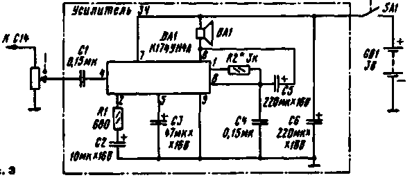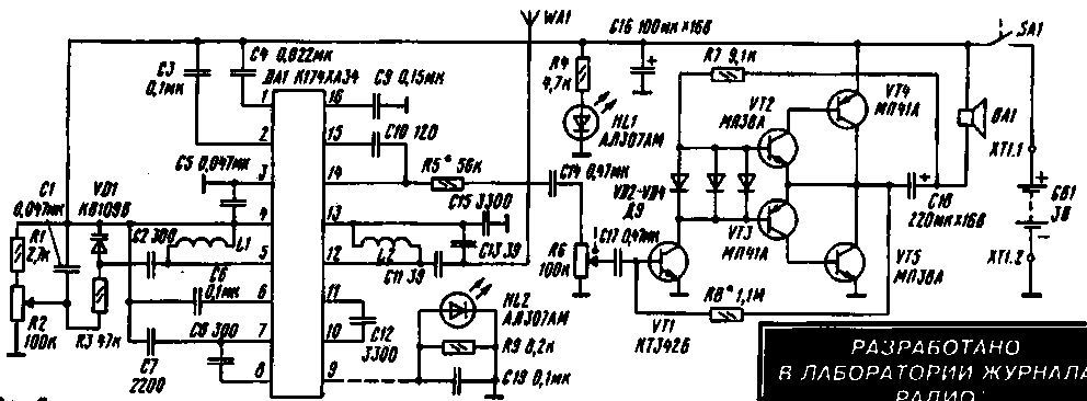Puc.1 Основу приемника (рис. 1) составляет многофункциональная микросхема К174ХА34 (DA1), которая представляет собой готовый супергетеродинный УКВ приемник, поскольку содержит и гетеродин, и смеситель, и усилитель ПЧ, и частотный детектор, и предварительный усилитель 3Ч. Кроме того, имеются амплитудный ограничитель и система автоподстройки частоты (АПЧ). Остается лишь подключить навесные элементы да "раскачать", при необходимости, выходной сигнал 3Ч до нужной мощности - это и было осуществлено в радиолаборатории журнала "Радио", причем с максимальным использованием типового включения микросхемы. С антенны WA1 (ею служит плетеная ручка приемника из многожильного монтажного провода в изоляции) принимаемый сигнал поступает на широкополосный входной колебательный контур L2C11C13, рассчитанный на выбранный диапазон, а с контура - на вход микросхемы (выводы 12, 13). К другому входу микросхемы (выводы 4. 5) подключен контур гетеродина L1C2VD1. Изменением резонансной частоты этого контура настраивают приемник на нужную радиостанцию. Органом настройки в данном случае является варикап VD1. Его емкость изменяют электронным способом, подавая на варикап то или иное постоянное напряжение, снимаемое с движка переменного резистора R2. При этом частота настройки гетеродина превышает частоту сигнала принимаемой радиостанции на 75 кГц- значение промежуточной частоты. Вся остальная обработка сигналов - смешение, усиление сигнала ПЧ, детектирование, предварительное усиление сигнала 3Ч осуществляется микросхемой. В итоге на выводе 14 появляется сигнал 3Ч амплитудой не менее 100 мВ, который, в принципе, можно подавать на головной телефон сопротивлением не менее 100 Ом. Для получения наибольшего выходного сигнала 3Ч вывод 16 микросхемы соединен с общим проводом через конденсатор С9. а для корректировки предыскажений сигнала ЧМ и обеспечения большей устойчивости работы усилителя между выводами 15 и 14 включен конденсатор С 10, образующий отрицательную обратную связь. На выводе 9 микросхемы формируется постоянное напряжение, обратно пропорциоиальное уровню несущей частоты. Его можно использовать, например. для индикации настройки приемника на радиостанцию - светодиод HL2, являющийся одновременно индикатором включения приемника, при точной настройке на радиостанцию будет гаснуть. Правда, в данном варианте приемника эта цепь не реализована. Катушка L1 содержит 12 витков на каркасе диаметром 5 мм, длина намотки 12...16 мм. L2 содержит 7 витков на таком же каркасе, длина намотки 7...10 мм. Провод для обеих катушек - ПЭВ 0,9. Выходной сигнал 3Ч поступает с микросхемы на переменный резистор регулировки громкости R6, а с его движка - на усилитель 3Ч, выполненный по двухтактной схеме на транзисторах VT1-VT5. Но возможно применение других вариантов усилителей, способных работать на нагрузку сопротивлением 8 Ом при питающем напряжении 2-3 В. Рассмотрим некоторые из них.