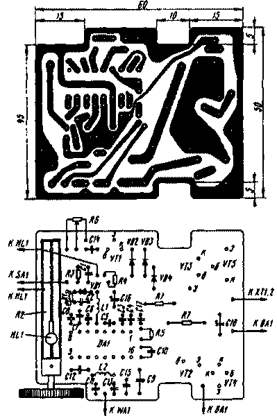 Puc.2 Более всего этим требованиям удовлетворяет усилитель, выполненный на микросхеме К174УН4А (рис. 2), несмотря на то, что в справочнике на нее приведена нижняя граница питающего напряжения 5,4 В. Тем не менее эксперименты показали, что собранный по приведенной схеме усилитель при напряжении питания 3 В развивает на нагрузке сопротивлением 8 Ом выходную мощность 50...60 мВт и сохраняет работоспособность при снижении напряжения до 2 В. Достоинство усилителя также и в малом токе потребления: в режиме молчания - 3 мА, при максимальной громкости - 40...50 мА. Недостатком усилителя следует признать искажения типа "ступенька", которые становятся заметны при уменьшении питающего напряжения и амплитуды входного сигнала. Следующим вариантом может быть усилитель 3Ч, выполненный на микросхеме К174УН17, рассчитанной на работу с высокоомными (не менее 30 Ом) стереофоническими головными телефонами. В данном случав вместо телефонов будет работать, например, динамическая головка 0.5ГДШ-1 со звуковой катушкой сопротивлением 50 Ом. При напряжении 2...3 В такой усилитель сможет развивать выходную мощность около 20 мВт, что обеспечит достаточно громкое звучание. Усилитель 3Ч на микросхеме К174УН14 работает без искажений при минимальном напряжении питания 2,5 В. Недостатком такого усилителя является значительный ток потребления - это необходимая плата за "чистый* и громкий звук. Так, при питающем напряжении 3 В ток покоя составлял 17 мА. При входном сигнале амплитудой 40 мВ выходное напряжение достигало 1 В, потребляемый ток - 40 мА, а выходная мощность на нагрузке сопротивлением 8 Ом - 45 мВт. Если использовать две микросхемы К174УН14 и включить их по мостовой схеме, то при питающем напряжении 3 В можно добиться выходной мощности 100... 110 мВт на той же нагрузке 8 Ом, но значительно (до 120... 130 мА) возрастет максимальный потребляемый ток, что неприемлемо для малогабаритного приемника. Опробован и вариант использования микросхемы К174УН20, представляющей собой стереоусилитель для переносной и автомобильной аппаратуры. Она содержит в своем корпусе как бы два микросхемы К174УН14 и имеет несколько лучшие параметры по сравнению с К174УН14 в обычном и мостовом включении. К примеру, нижняя граница питающего напряжения сместилась к 2,2 В, а выходную мощность в мостовом включении 100.. .110 мВт на нагрузке 8 Ом удалось получить при напряжении 3 В и токе потребления 80...100 мА. Усилитель 3Ч на микросхеме К174УН7 начинал работать без искажений при питающем напряжении 3,8 В, его выходная мощность на нагрузке сопротивлением 8 Ом составляла 50 мВт при потребляемом токе 35 мА. С таким же напряжением получались хорошие результаты в случае использования операционного усилителя К157УД1, обладающего максимальным выходным током 300 мА. Многие вопросы при построении усилителей 3Ч для низковольтной миниатюрной аппаратуры снимаются при использовании микросхемы К174УН23 - двухканального усилителя мощности 3Ч с электронной регулировкой громкости. Эта микросхема может работать как в стереофоническом режиме с выходом на головные телефоны, так и в мостовом монофоническом варианте с нагрузкой на низкоомную динамическую головку. Печатная плата радиоприемника приведена на рис.3. Д. МАКАРОВ, г. Москва
