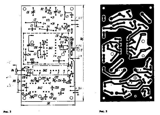 Большинство радиоэлементов приемника установлено на печатной плате, выполненной из одностороннего фольгированного стеклотекстолита толщиной 1,5...2 мм. Размещение деталей показано на рис. 2, фотошаблона - на рис. 3.