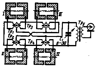 Ю. МЕДИНЕЦ (UB5UG) г. Киев Пожалуй, никакая часть оборудования "лисолова" не остается настолько неизменной, как антенна. Новые транзисторы и малогабаритные компоненты позволяют строить все более чувствительные, экономичные и легкие приемники, а антенны остаются прежними, хотя их вес и габариты всегда являются помехой для спортсмена. Появившиеся в последние годы кольцевые сердечники из высокочастотного феррита дают возможность простыми средствами строить антенные решетки с активным питанием всех элементов. При этом можно добиться того же эффекта, что п в пассивных антеннах, сдвиг фаз в которых подбирается расстоянием между элементами, изменением полярности трансформаторов. Ниже описывается антенна с активным питанием на диапазоны 28 и 144 Мгц, построенная на принципе синфазно-противофазного питания элементов. Основу антенны составляет комбинация противофазной пары излучателей и диполя. Диаграмма направленности противофазной пары- восьмерка. Ее э.д.с. меняет знак в зависимости от направления прихода сигнала. Диаграмма диполя (в плоскости Н) - круг. Полярность э. д. с. диполя не зависит от направления. Если сложить э.д.с. противофазной пары и диполя, совмещенных в пространстве, суммарная диаграмма направленности будет однолепестковой (в частности - кардиоидой, если амплитуды двух э.д.с. равны). Схема антенны показана на рис. 1. Элементы антенны I - IV и трансформаторы Тр1 - Tp4 включены таким образом, что составляют две системы противофазных пар и диполей. Э.д.с. каждой противофазной пары снимается с обмоток трансформаторов, включенных последовательно, а э.д.с. диполей - между средними точками обмоток. При такой запитке элементов разделяются синфазные и противофазные токи, которые, суммируясь в общей нагрузке (трансформатор Tp5, и конденсатор C1), дают однонаправленную диаграмму. Связь с антенной выбирается витками вторичной обмотки трансформатора Тр5.