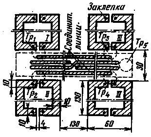 Рис.2 Настройка антенны сводится к настройке в резонанс контура Тр5С1. Для "углубления нолей" можно ввести дополнительный конденсатор, включив его между средними точками обмоток трансформаторов Тр3, Тр4 или в разрыв одного из проводов, соединяющих средние точки обмоток. Если выбранные размеры отличаются от приведенных на чертеже, то можно попробовать улучшить настройку антенны включением конденсатора между средними точками обмоток Tp1, Тр2. РАДИО, N 7 1970г. с. 31